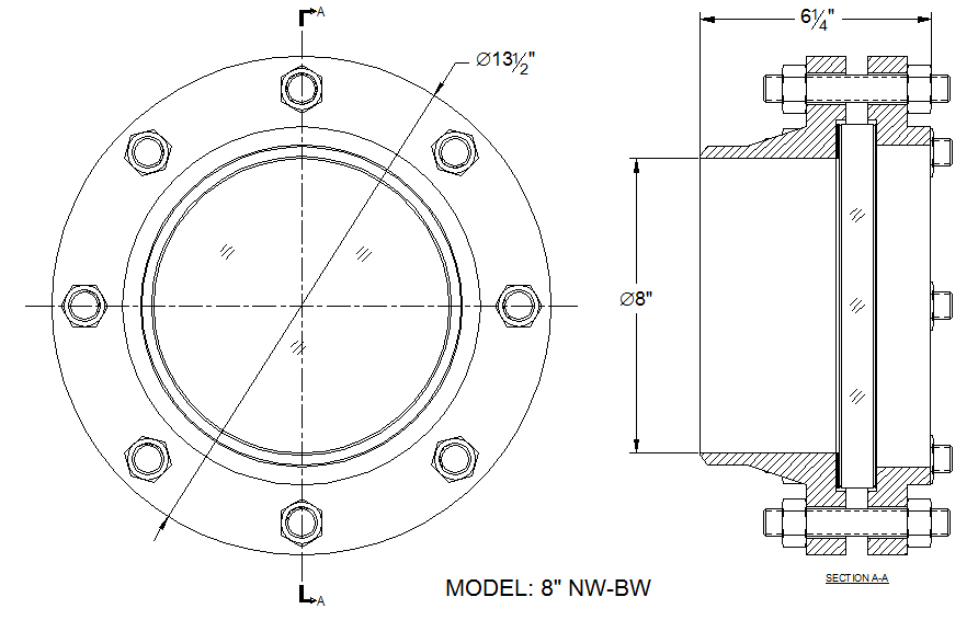 8″ ANSI B16.5 weld neck style sight glasses are designed for welding to a stub end pipe or may be supplied with a cut radius on the weld neck to straddle the side of a pipe. Each is rated for 150PSIG (10.3 Barg) at 300ºF (149ºC) with a tempered soda lime lens and 500ºF (260ºC) with a borosilicate lens.